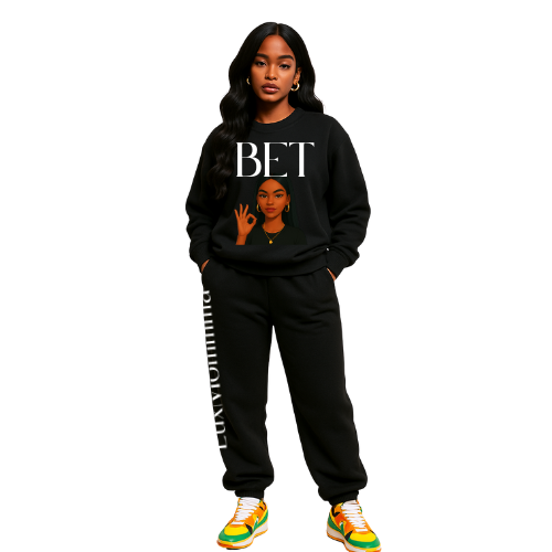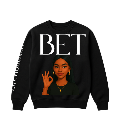 Say less, wear more energy. The Luxmommma “BET” Crewneck speaks volumes without saying a word — bold, confident, and unapologetically luxe. Featuring a sleek minimalist graphic that radiates boss energy, this piece pairs perfectly with any item from the Lux Set Collection for a mix-and-match moment that turns comfort into a statement.
