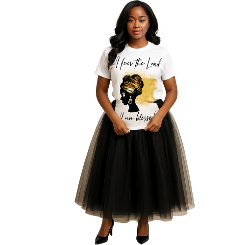 Radiate faith and elegance in this powerful statement tee. Featuring a stunning silhouette of a woman crowned in a gold headwrap against a soft gold backdrop, this shirt beautifully blends spirituality and style. The bold message — “I fear the Lord, I am blessed” — reminds you to walk with confidence and grace wherever you go.