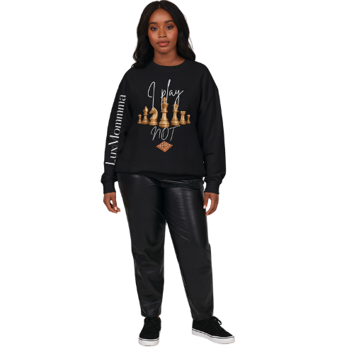 Command attention without saying a word. This bold black crewneck sweatshirt features striking gold chess pieces and a sleek chessboard accent, making a powerful statement: you’re not here for games. Crafted for comfort with a luxe streetwear edge, it pairs perfectly with leather pants, jeans, or sneakers for a confident, elevated look. The sleeve detail carries the signature LuxMommma BRAND, adding that exclusive touch.